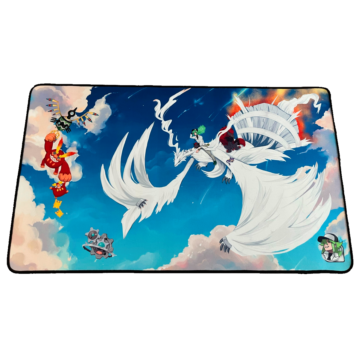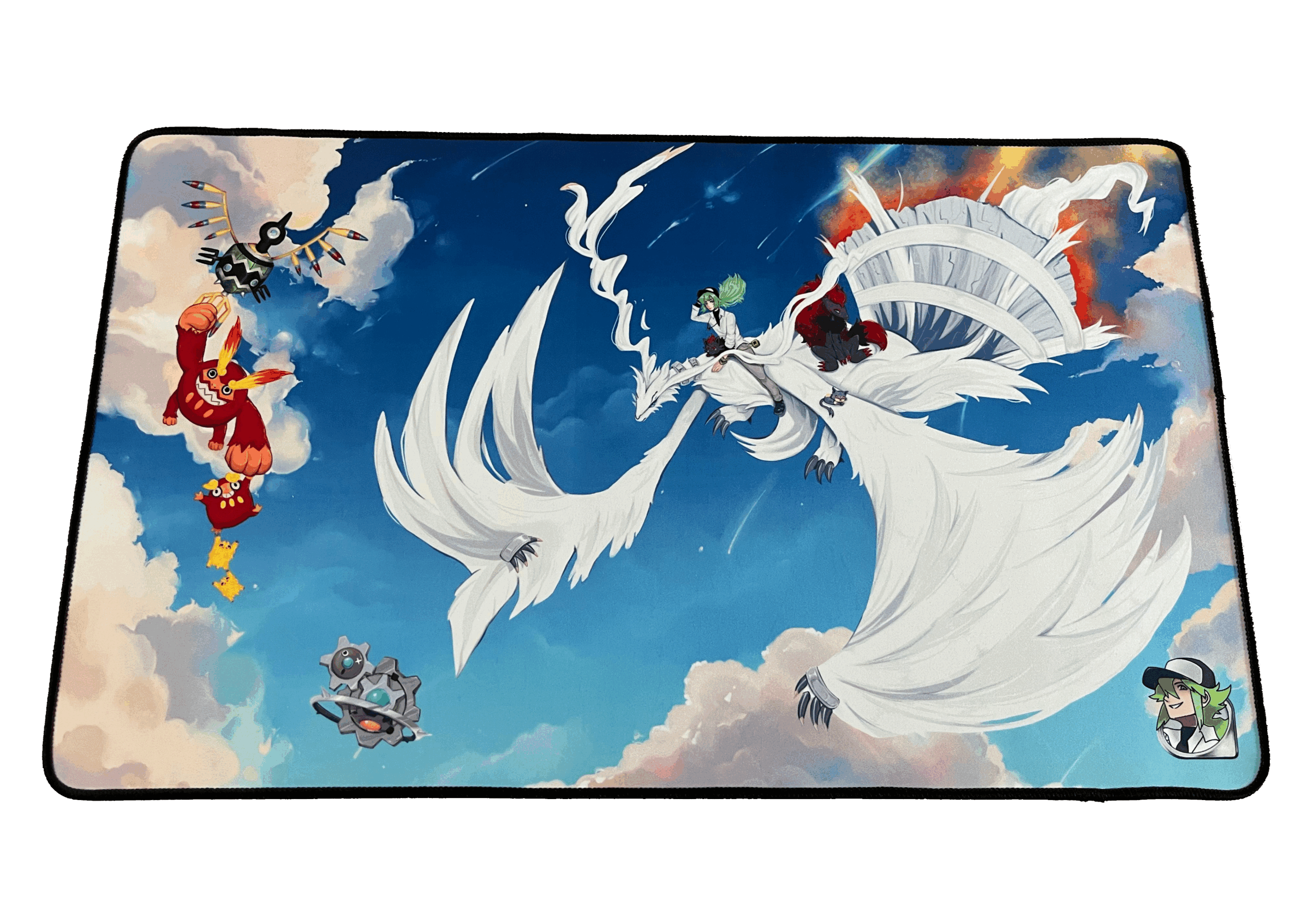 Te presentamos este exclusivo tapete de juego inspirado en el entrenador N y sus Pokémon, con Reshiram como protagonista. Ilustrado a mano por nuestra artista y parte de la colección «Juntos de Aventuras», este tapete combina arte y funcionalidad en una sola pieza.